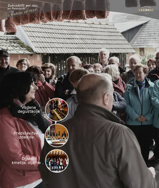 Za večje in manjše skupine je na voljo strokovna degustacija olj, voden ogled kmetije Pečarič ter nudimo v najem degustacijsko čudovito leseno dvorano. Na voljo sta tudi dva počitniška apartmaja v katera lahko sprejmemo do 12 oseb.
